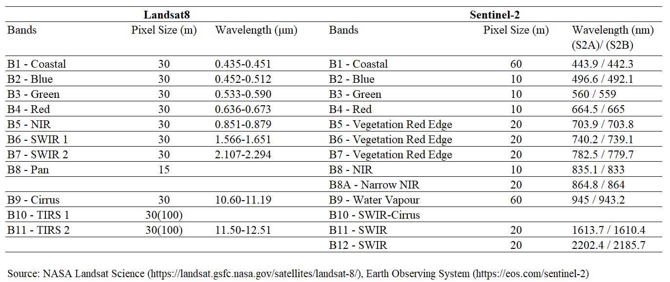 Under Landsat8, we decided to use bands 1-7 as they have the same spatial resolution of 30m. Similarly, we decided to use bands 2,3,4,8 for Sentinel 2, as they have the same spatial resolution of 10m (Figure 3.1).