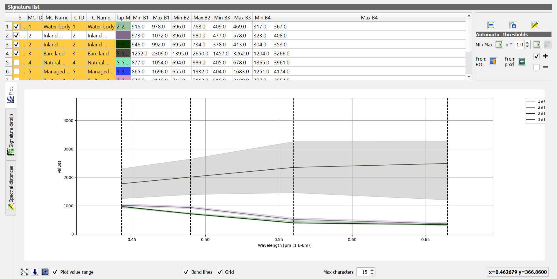 Spectural Signature includes several functions for displaying spectral signature values as a function of wavelength(defined in the band set). If common classifications are too near to the extent that they overlap, it will be hard differentiate the different classes(e.g managed vegetation, natural vegetation)