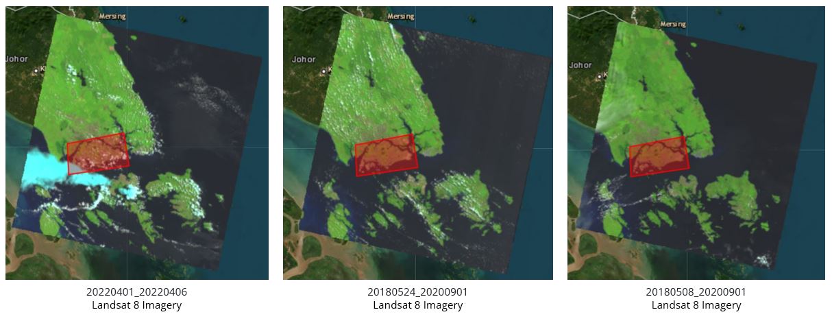 Here are some of the potential data sets (Figure 2.1) that we have chosen to work with. However, as we can see from Figure 2.2 , there are some imagery that has massive cloud cover around Singapore. Hence we eliminate them and chose 20180524 scene data.