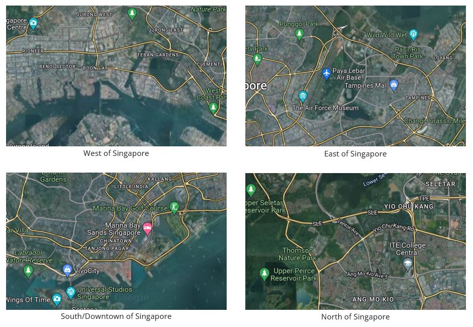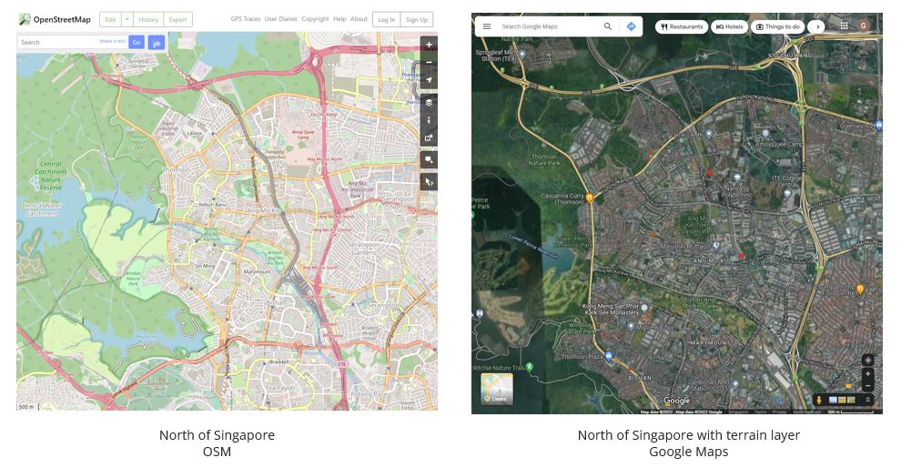 We chose Singapore as our primary area of study as our team felt more familiar with the identification of land covers in our local country. We ventured around Singapore to find areas suitable for land classification. Through Open Street Map and Google Maps, we compared between different parts of Singapore (Figure 1.1) and found that the North of Singapore has an abundance of green covers and water bodies that can be further classified (Figure 1.2).